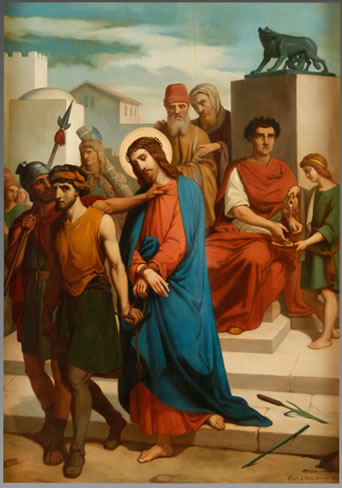 Dito isto, [Pilatos] foi ter de novo com os judeus e disse-lhes: «Não vejo n’Ele nenhum crime. Mas é costume eu libertar-vos um preso na Páscoa. Quereis que vos solte o rei dos judeus?» Eles puseram-se de novo a gritar, dizendo: «Esse não, mas sim Barrabás!» Ora Barrabás era um salteador. Pilatos não encontra particulares culpas que possa atribuir a Jesus, cede à pressão dos acusadores e, assim, o Nazareno é condenado à morte. |