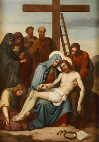 Depois disto, José de Arimateia, que era discípulo de Jesus, mas secretamente por medo das autoridades judaicas, pediu a Pilatos que lhe deixasse levar o corpo de Jesus. E Pilatos permitiu-lho. Veio, pois, e retirou o corpo.Maria vê morrer seu Filho, Filho de Deus e também d’Ela. Sabe que é inocente, mas carregou sobre Si o peso das nossas misérias. A Mãe oferece o Filho, o Filho oferece a Mãe. A João, a nós. Jesus e Maria, eis um família que, no Calvário, vive e sofre a separação suprema. A morte divide-os, ou pelo menos parece dividi-los, uma mãe e um filho com um vínculo simultaneamente humano e divino inconcebível. Por amor, o oferecem. Abandonam-se ambos à Vontade de Deus.Uma espada trespassará a tua alma. Assim hão-de revelar-se os pensamentos de muitos corações. (Lc 2,25) |