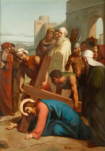 «Vinde a Mim, todos os que estais cansados e oprimidos, que Eu hei-de aliviar-vos. Tomai sobre vós o meu jugo e aprendei de Mim, porque sou manso e humilde de coração e encontrareis descanso para o vosso espírito. Pois o meu jugo é suave e o meu fardo é leve». Jesus cai. As feridas, o peso da cruz, a estrada a subir, em mau estado.E os empurrões da multidão. Mas não foi só isto que O reduziu a este estado. Talvez seja o peso da tragédia que tem início na sua vida. Já não se consegue ver Deus em Jesus, homem que Se mostra tão frágil, que tropeça e cai. |